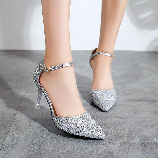 Ivory Beige Satin Pointed Toe Pearl Embellished Ankle Strap Wedding Shoes