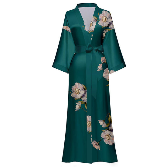 Elegant White Satin Robe with Lace Sleeves and Belted Waist