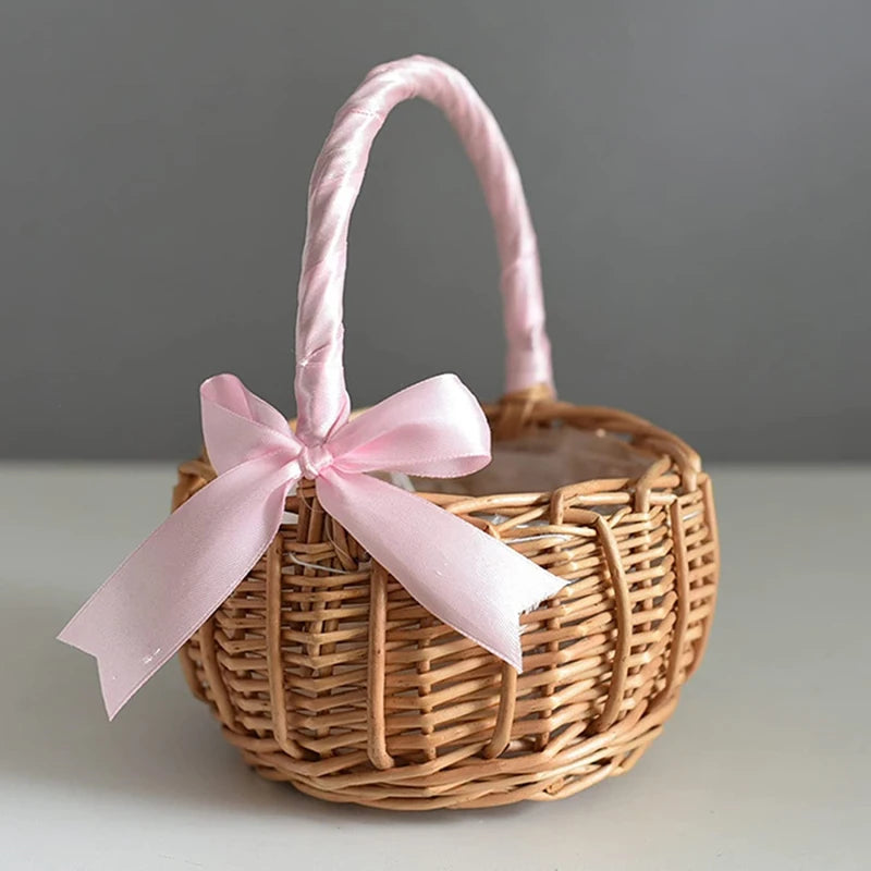 سلة زهور من الخيزران مزينة بفيونكة من الساتان