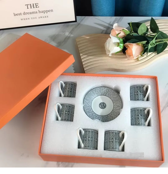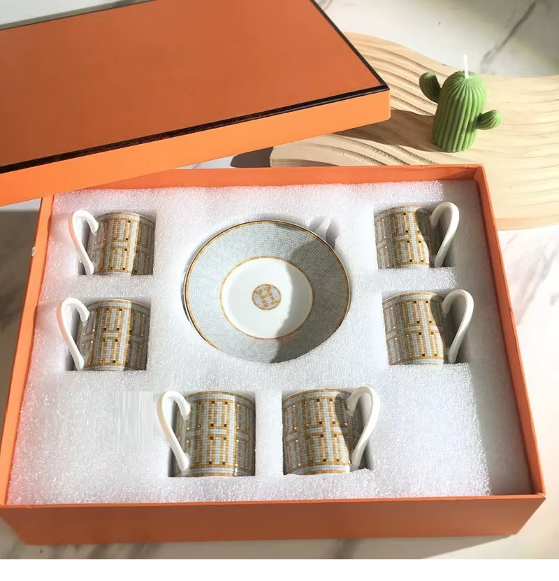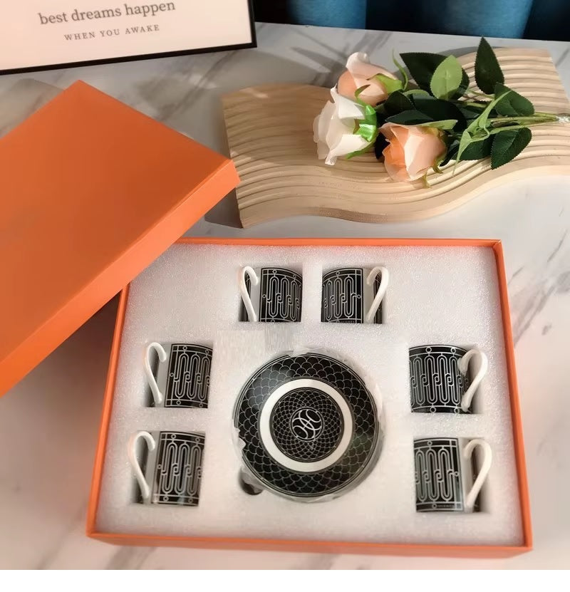 Experience the ultimate in luxury with our elegant Art Deco coffee cup and saucer set. Indulge in the sophisticated and exclusive style of six matching cups and saucers, complete with a stunning black and white design or adorned with gold trim pattern. Packaged in a beautiful and ethically-sourced gift box, this set is the epitome of tastefulness and elegance.