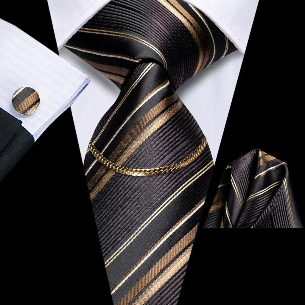 Hi-Tie Business Black Luxury Plaid Mens Tie Silk Neckties Fashion Tie Chain Hanky Cufflinks Set Design Gift For Men Wedding