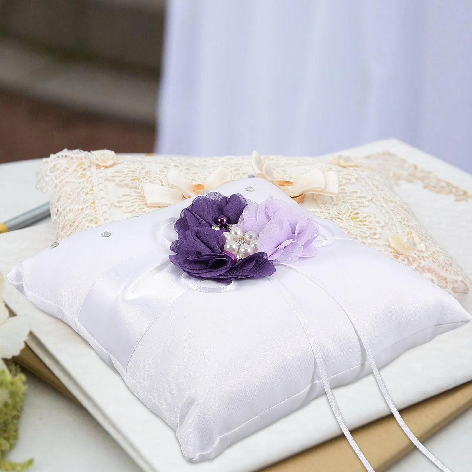 Add a romantic and elegant touch to your wedding ceremony with this Pearl Flower Wedding Ring Pillow, beautifully designed in a soft taro shade with delicate purple floral accents. Crafted from smooth satin and finished with decorative ribbons and faux pearl flower detailing, this ring bearer pillow creates a graceful and eye-catching way to present your wedding rings as you walk down the aisle.
