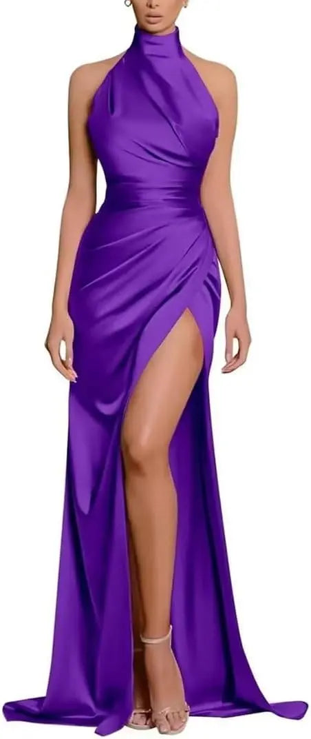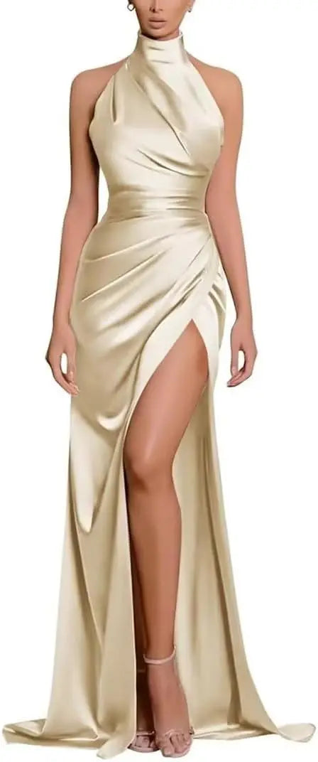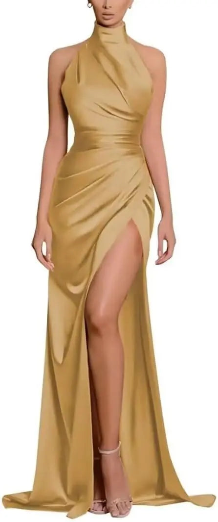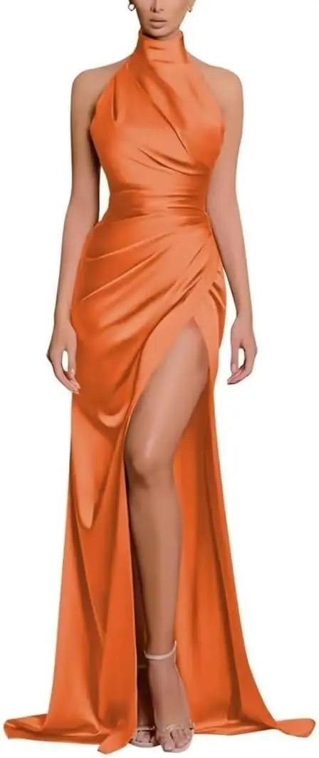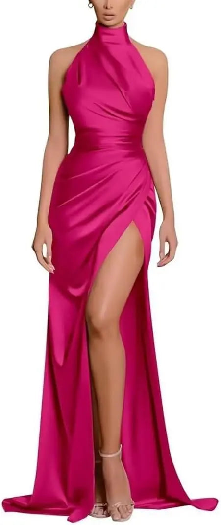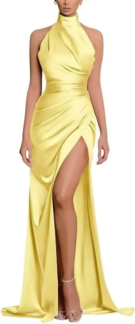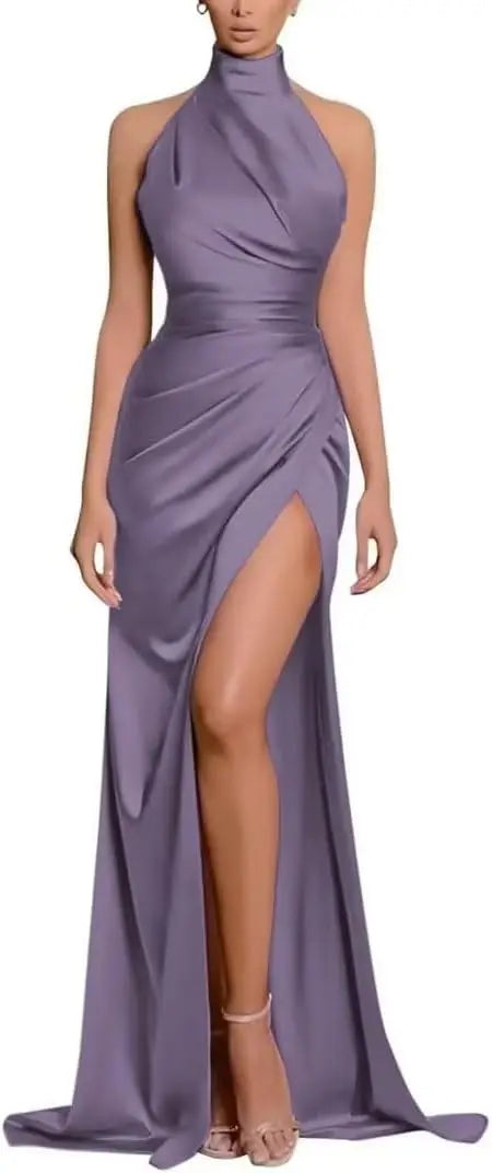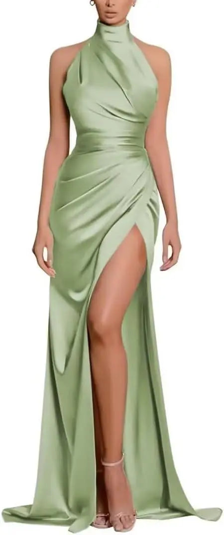 Satin Maxi Dress Halter Neck Side Slit Bridesmaid Dress