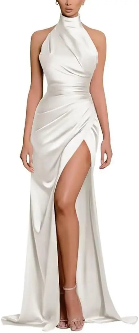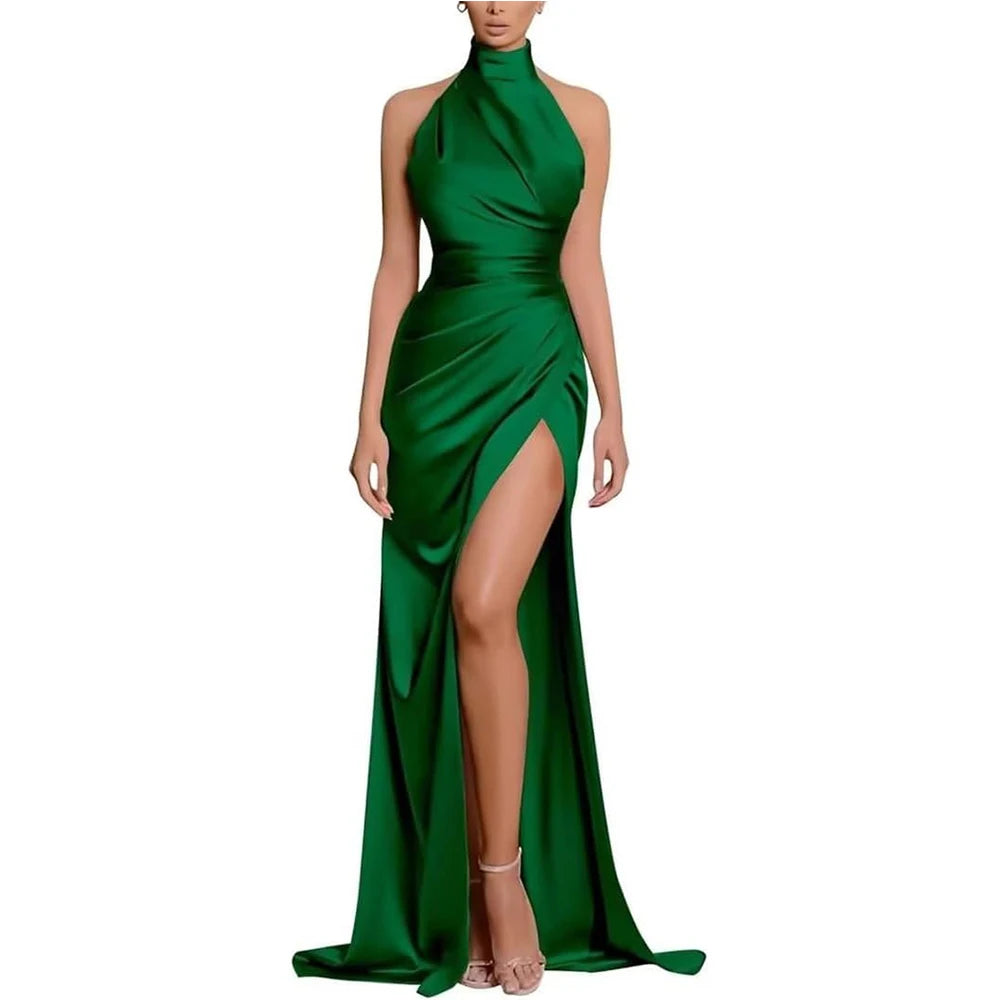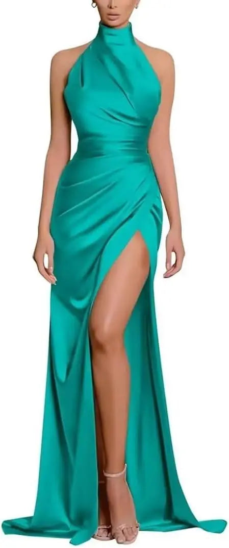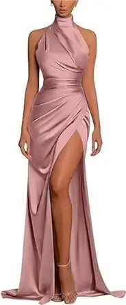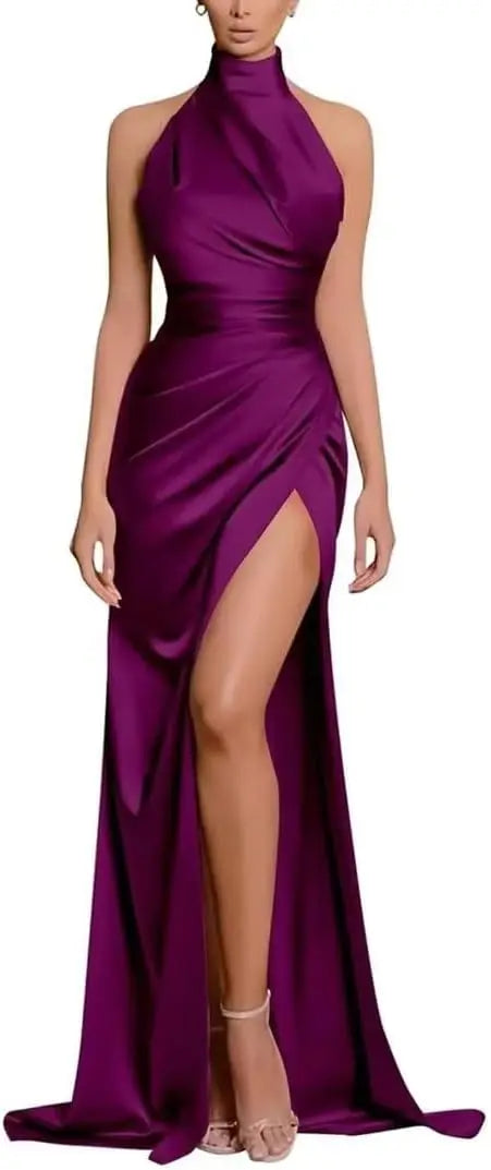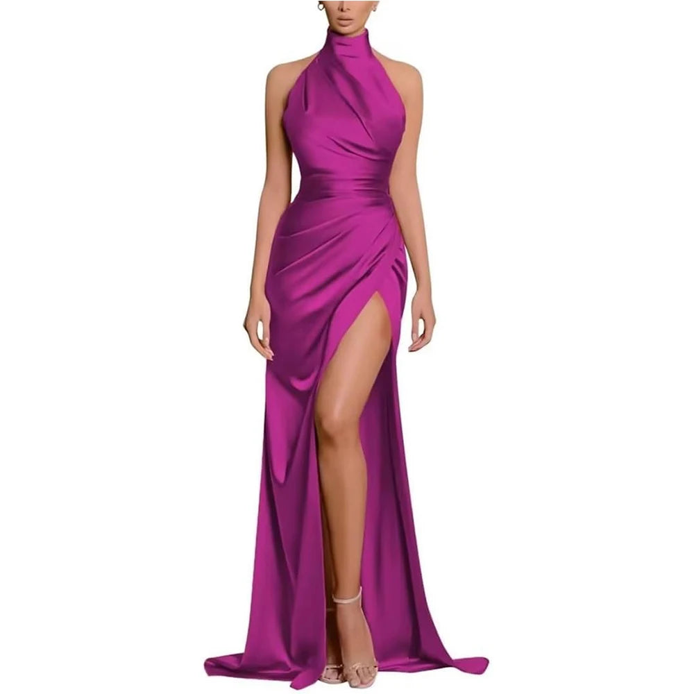 Satin Maxi Dress Halter Neck Side Slit Bridesmaid Dress