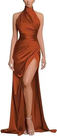 This custom-made satin maxi dress features a halter neck and a stylish side slit, tailored to your preferred colour. Its elegant design makes it an ideal choice for formal occasions, including bridesmaid duties and proms, combining sophistication with comfort for a flawless fit.
